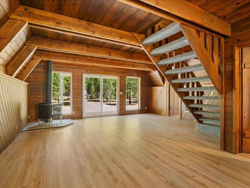 Charming classic A-frame cabin on a private 1-acre lot near the National Forest! This beautifully updated 3 bedroom retreat features a stunning wall of windows and a cozy wood-burning fireplace that fills the living room with natural light and mountain charm. Recent updates include brand-new LVP flooring and an updated kitchen with new cabinets and countertops. The flexible layout offers a bedroom and bathroom on each level, plus a spacious loft that could serve as a 4th bedroom or office. Outside, enjoy a large detached shop ideal for RV or boat storage, workshop space, and two garden sheds. Peaceful, private setting with room to roam.
