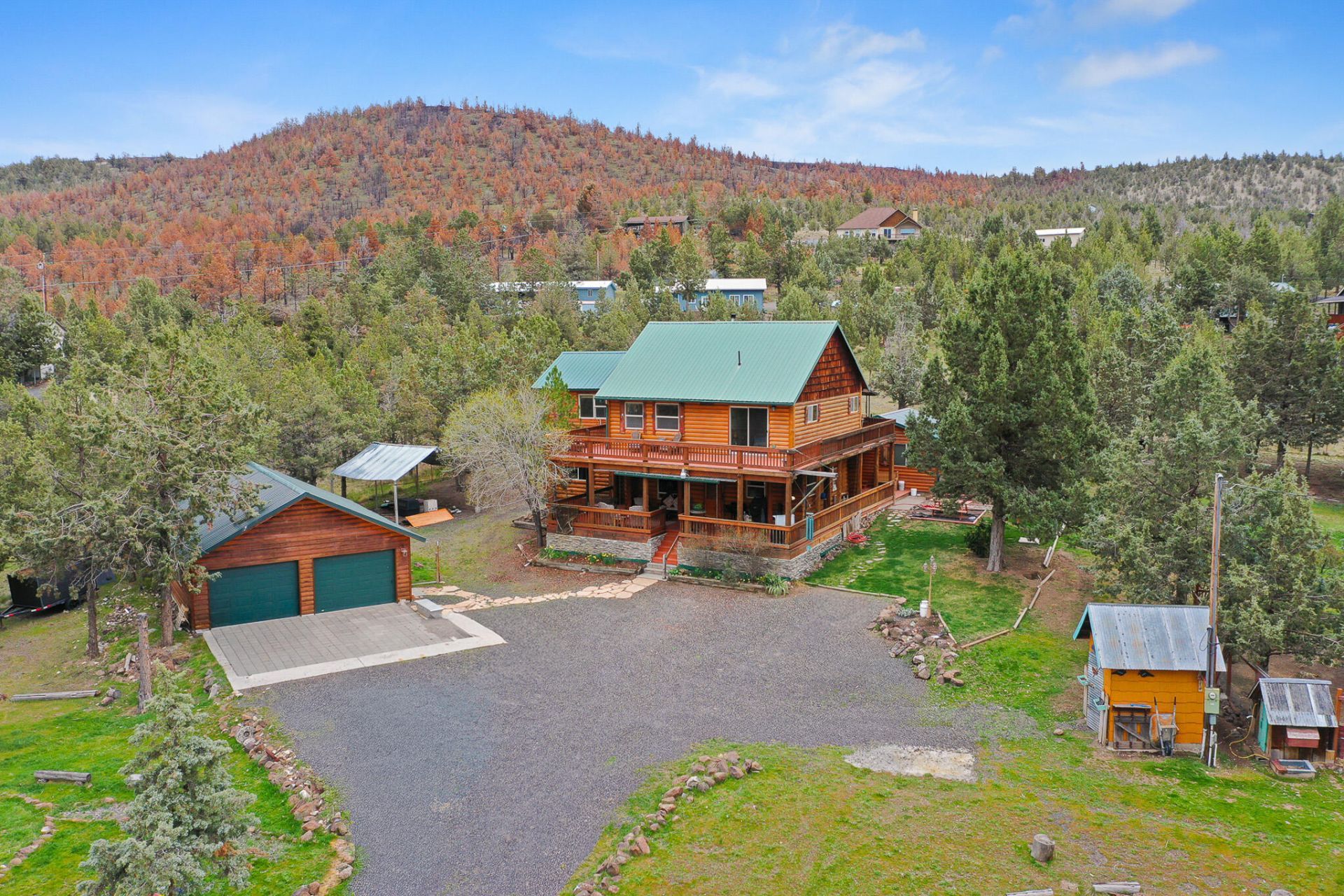 Experience true rustic charm with this stunning log home in Prineville, Oregon, Central Oregon living at its finest. This 3-bedroom, 3-bath home is filled with warmth and character, featuring wood and pellet stove heating for cozy, efficient comfort. Enjoy breathtaking views from the large covered wrap-around front deck or step out onto the private deck off the upstairs primary suite. Situated on 2 fully fenced and gated acres, this property is perfect for those seeking space, privacy, and a country lifestyle. Outbuildings include a detached 2-car garage with storage room, a 1-car detached garage with workshop space and covered storage for wood or hay, plus a chicken coop, greenhouse, and raised garden beds, ideal for hobby farming or sustainable living. If youve been searching for a log home with acreage in Prineville, Oregon, this one is a must-see, schedule your private tour today!