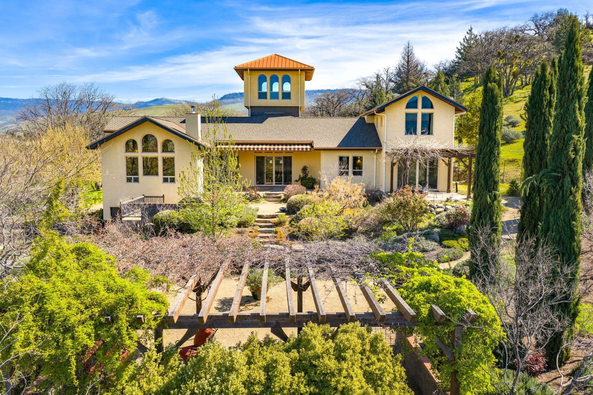 Nestled on 5.35 acres, this gorgeous Tuscan-style home offers stunning scenery and peaceful living just minutes from the renowned Bella Fiore Winery. This home is the perfect blend of elegance, space and functionality. The home features a primary suite on the main level, 2 spacious bedrooms upstairs, chefs kitchen that opens into the family room complete with a woodstove and sweeping pristine views. The home is filled with natural light and the new interior paint enhances the architectural elements while making the home feel modern and fresh. The unique tower space adds character and versatility- ideal for a 4th bedroom, home office, art studio or yoga retreat. Downstairs there is a large room for entertaining and wine storage. The professionally landscaped yard features stunning color, along with a shop and creek running through the property. Enjoy the serenity of country living close to town.